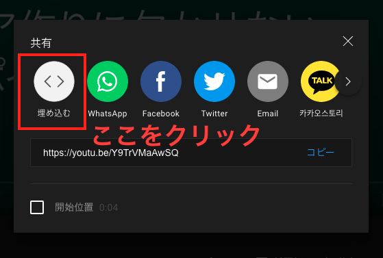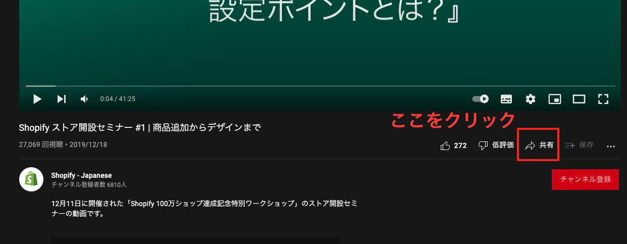 動画の右下に「共有」と書かれたブロックがあるので、これをクリックします。
